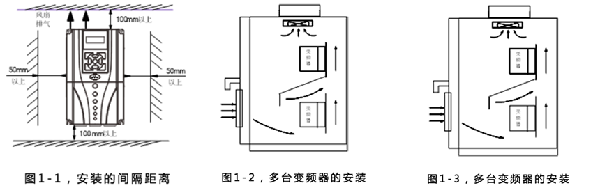 安裝間隔及距離要求,如圖1-1所示;多臺變頻器的安裝,如圖1-2所示,